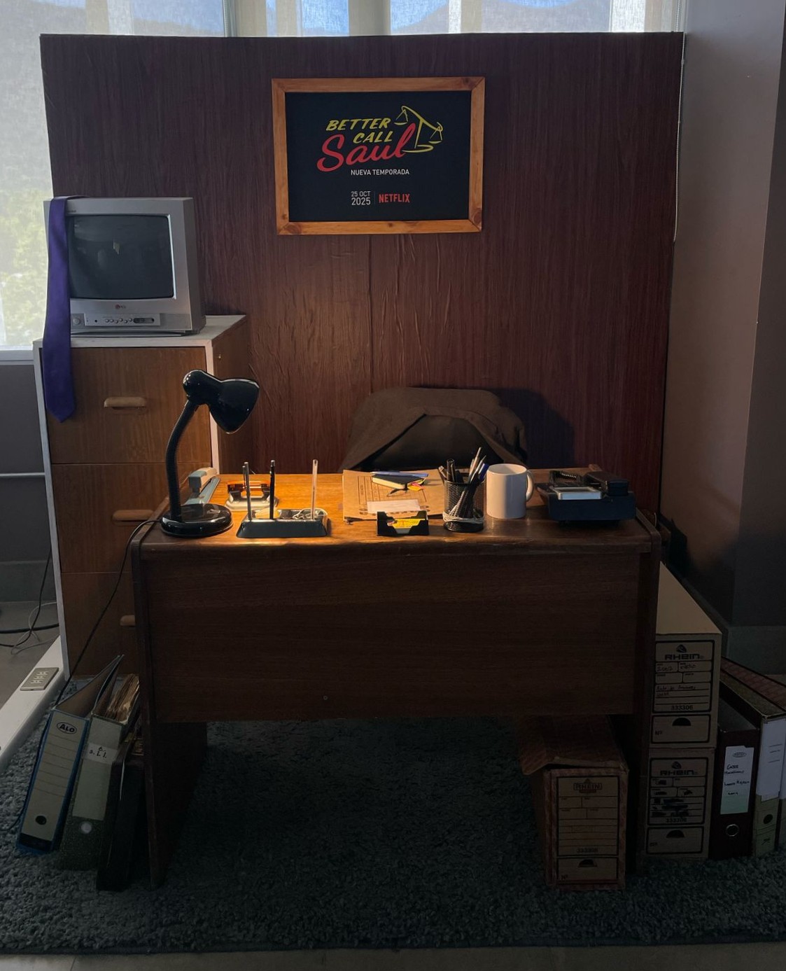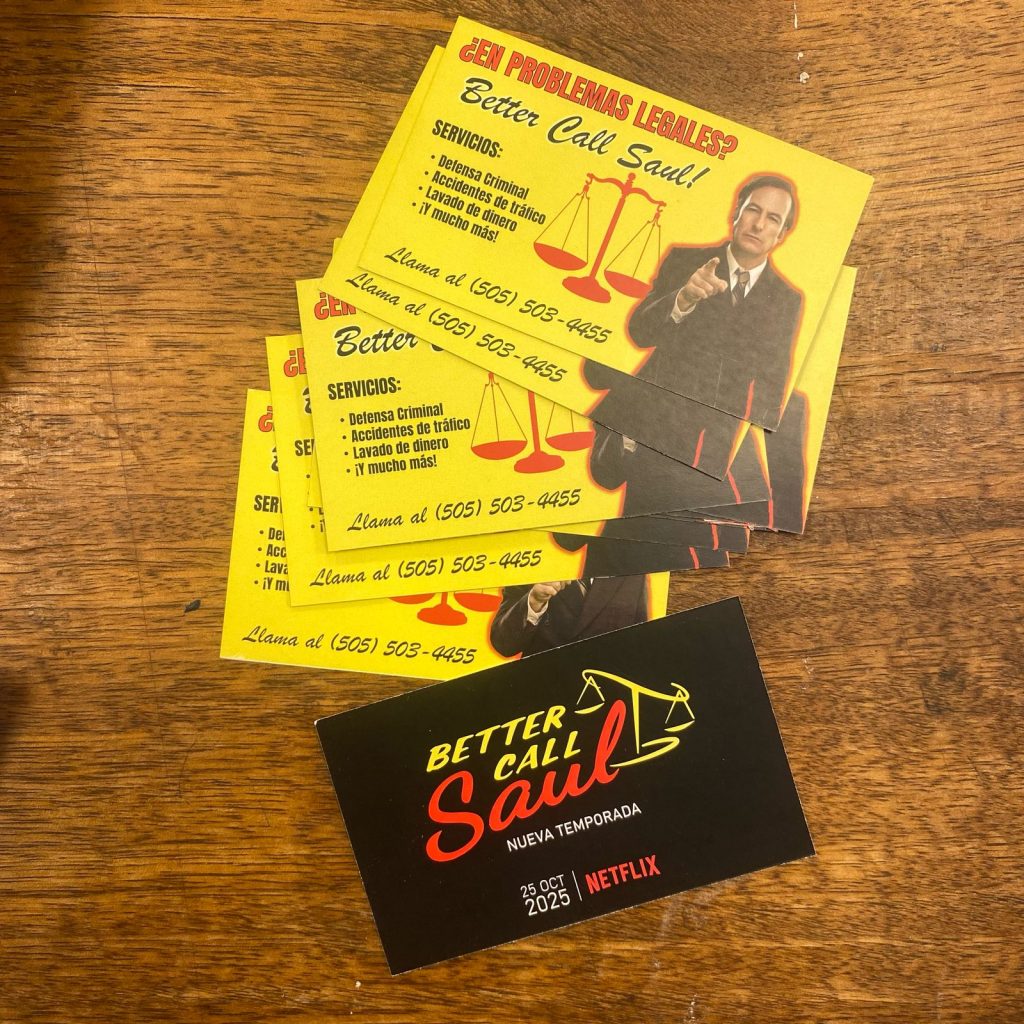 Para promocionar una nueva temporada ficticia de Better Call Saul, se creó una activación que recreara la oficina de Saul Goodman, capturando su esencia dual y su doble moral a través de una dirección de arte detallada. El espacio está lleno de elementos que reflejaran su naturaleza ambigua: fajos de billetes dispersos que simbolizan su relación con el dinero fácil, múltiples celulares que representan sus conexiones clandestinas y firmas falsas insinúan su habilidad para manipular el sistema.